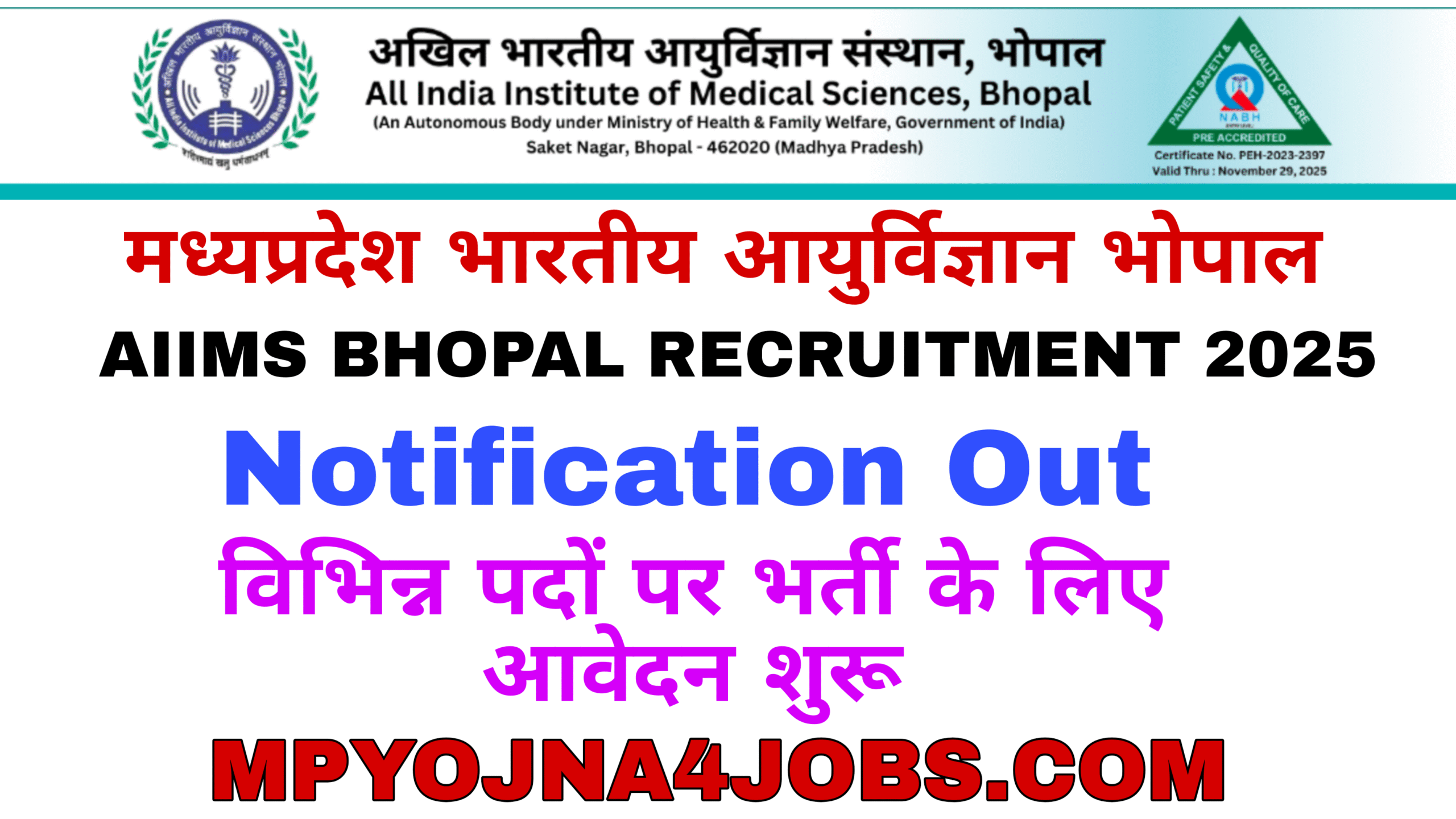 MP AIIMS Bhopal Recruitment 2025 – मध्यप्रदेश भारतीय आयुर्विज्ञान भोपाल द्वारा विभिन्न। पदों पर भर्ती के लिए आवेदन एवं नोटिफिकेशन जारी कर दिया है जिसमें योग्य एवं इच्छुक उम्मीदवार अपना आवेदन ऑफलाइन माध्यम से कार्यायल में दिनांक 08/09/2025 को अपना आवेदन फॉर्म भरके साक्षात्कार के लिए उपस्थित हो भर्ती से संबंधित अधिक जानकारी नीचे दी गई है ।