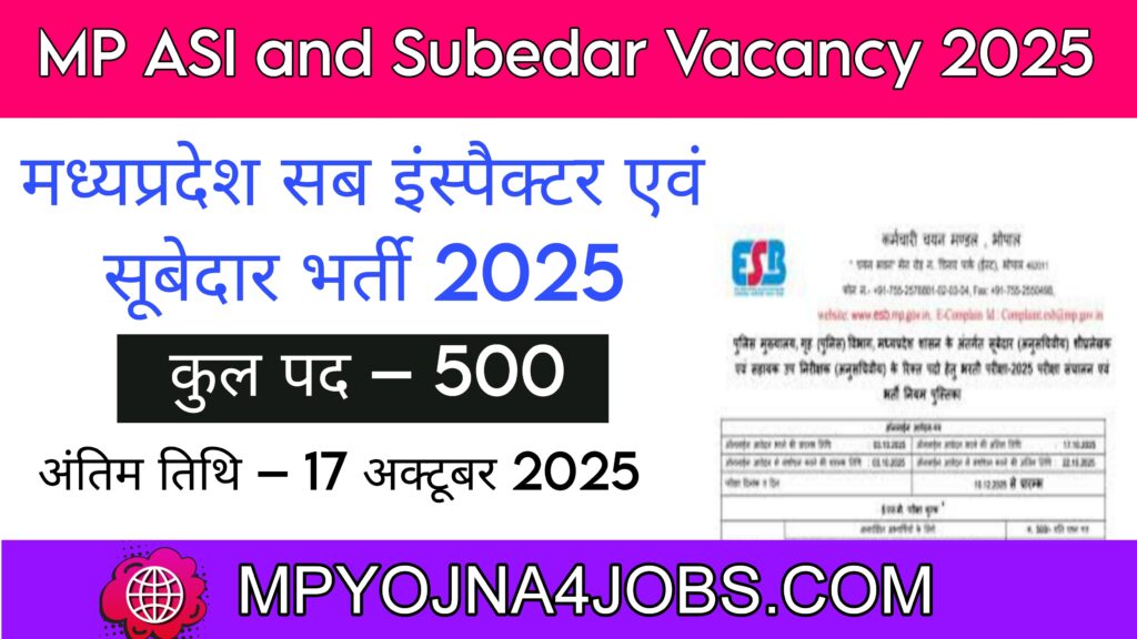 MP ASI and Subedar Vacancy 2025 :–मध्यप्रदेश कर्मचारी चयन मंडल आयोग (MPESB) द्वारा मध्यप्रदेश में सब इंस्पैक्टर एवं सूबेदार के 500 पदों पर भर्ती के लिए आवेदन एवं नोटिफिकेशन जारी कर दिया है । जिसमें योग्य एवं इच्छुक उम्मीदवार अपना ऑनलाइन आवेदन दिनांक 03 अक्टूबर 2025 से आवेदन की अंतिम तिथि 17 अक्टूबर 2025 तक कर सकते है । आवेदन से संबंधित अधिक जानकारी नीचे दी गई है ।