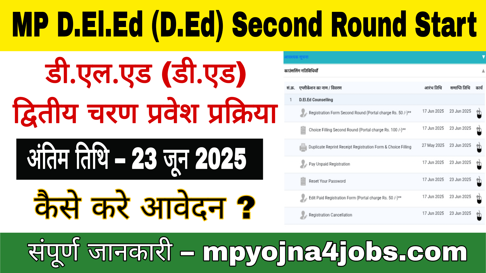 MP D.El.Ed Admission Second Round Online Apply – मध्यप्रदेश राज्य शिक्षा केंद्र द्वारा म.प्र. के सरकारी एवं प्राइवेट कॉलेज में डी.एल.एड (डी.एड ) पाठ्यक्रम में प्रवेश लेने हेतु द्वितीय चरण प्रारंभ कर दिया है | जिन अभ्यर्थी का प्रथम चरण में नाम नहीं आया वह एक बार फिर से अपनी चॉइस फिलिंग कर सकते है | जिसमे कक्षा 12 वी पास अभ्यर्थी ऑनलाइन आवेदन कर सकता है | ऑनलाइन आवेदन 17 जून से शुरू हो चुके है अभ्यर्थी आवेदन की अंतिम तिथि 23 जून 2025 तक अपना आवेदन कर सकता है | आवेदन से सम्बंधित जानकारी नीचे दी गयी है |