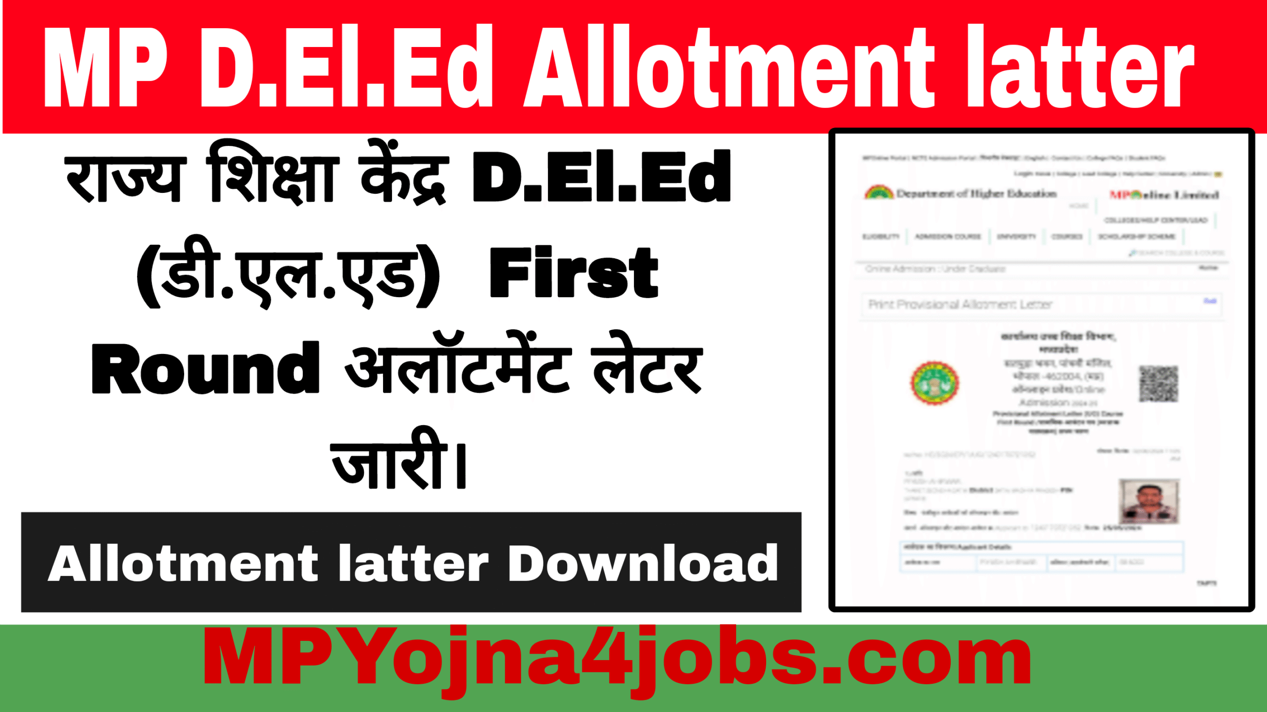 MP D.El.Ed Allotment letter – मध्यप्रदेश राज्य शिक्षा केंद्र द्वारा D.El.Ed (डी. एल.एड) प्रथम चरण के अलॉटमेंट लेटर जारी कर दिए है । जिन भी विद्यार्थियों ने डीएलएड पाठ्यक्रम में एडमिशन लेने के लिए आवेदन किए थे वो विद्यार्थी अपने अलॉटमेंट लेटर नीचे दी गई लिंक के माध्यम से अपना अलॉटमेंट लेटर डाउनलोड कर सकते है । जिन विद्यार्थियों का किसी भी संस्था में अगर नाम नहीं आया है तो वह विद्यार्थी निराश न हो अगले चरण की प्रतिक्षा करे और अगले चरण में एक बार फिर से अपनी choice filling करा लें।