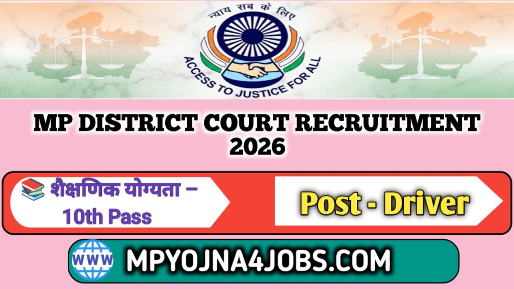 MP District Court Driver Recruitment 2026– मध्यप्रदेश जिला विधिक सेवा प्राधिकरण द्वारा ड्राइवर के विभिन्न पदों पर भर्ती के लिए आवेदन एवं नोटिफिकेशन जारी कर दिया है जिसमें योग्य एवं इक्छुक उम्मीदवार अपना आवेदन ऑफलाइन माध्यम से आवेदन की प्रारंभ तिथि 11 अप्रैल 2026 से आवेदन की अंतिम तिथि 15 अप्रैल 2026 तक कर सकते है आवेदन से संबंधी अधिक जानकारी नीचे दी गई है ।