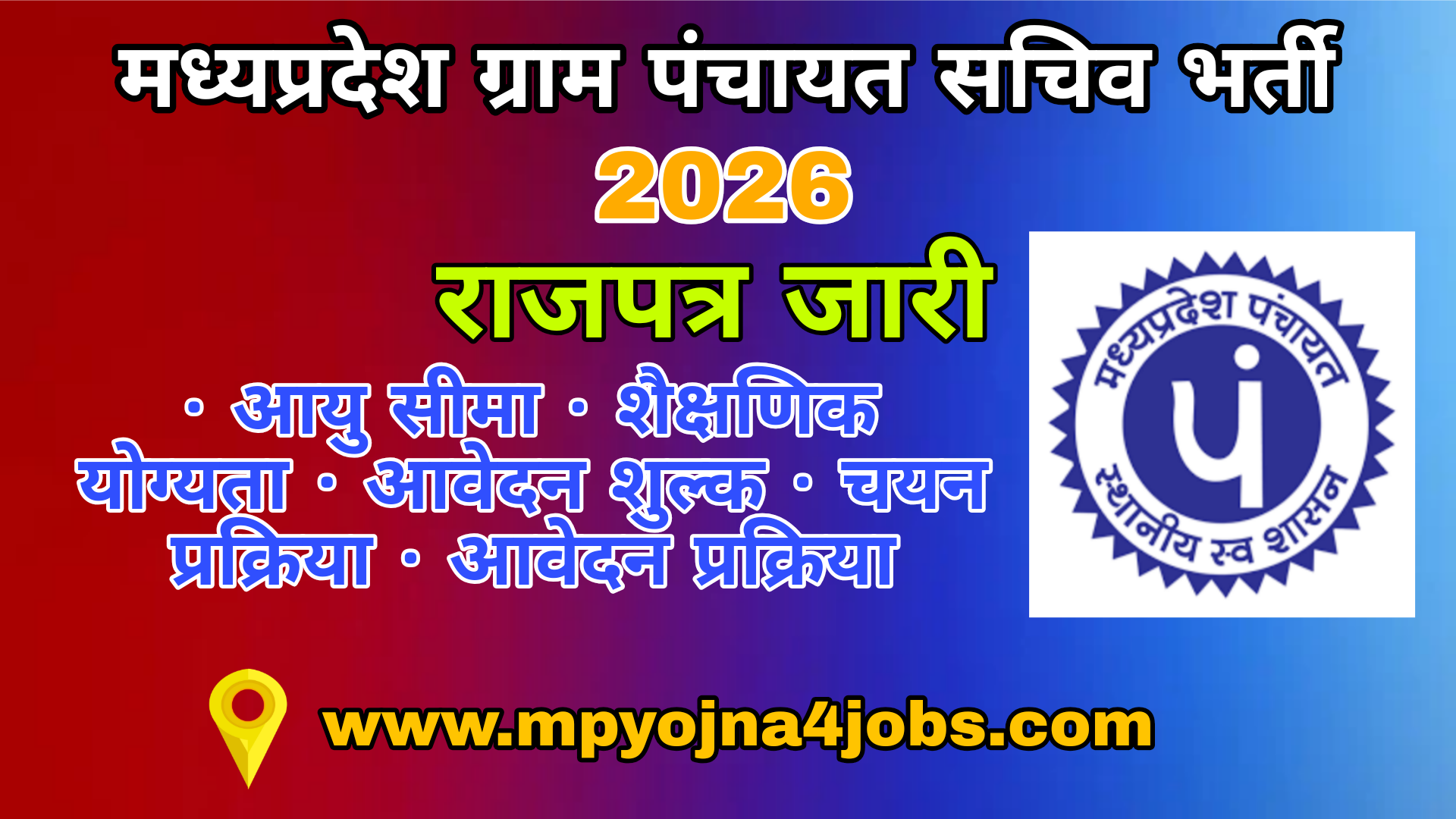 MP Gram Panchyat Sachiv Bharti 2026 – मध्यप्रदेश ग्राम पंचायत सचिव भर्ती 2026 के लिए पंचायत एवं ग्रामीण विकास विभाग द्वारा राजपत्र जारी कर दिया है जिसमें आवेदन से संबंधित समस्त जानकारी दी गई है । जो।भी इक्छुक उम्मीदवार है वह पूरी जानकारी नीचे देख सकता है जिसमें आवेदन शुल्क आयु सीमा , योग्यता , आवेदन प्रक्रिया , एवं चयन प्रक्रिया से संबंधित समस्त जानकारी दी गई है