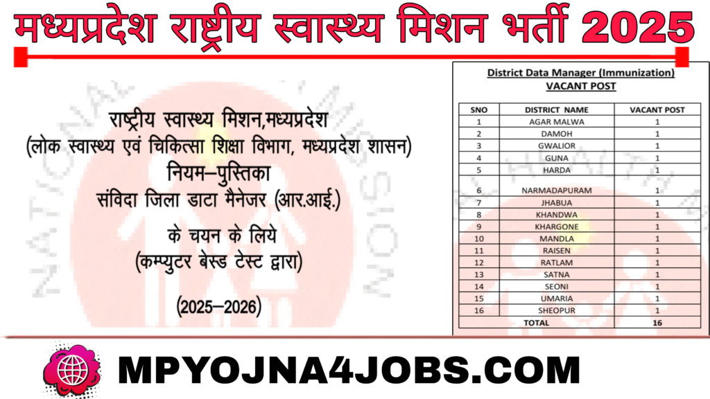 MP NHM Recruitment 2025 :- मध्यप्रदेश राष्ट्रीय स्वास्थ्य मिशन विभाग द्वारा विभिन्न जिलों में भर्ती के लिए जिला डाटा मैनेजर के पद पर आवेदन एवं नोटिफिकेशन जारी कर दिया है जिसमें योग्य एवं इच्छुक उम्मीदवार अपना आवेदन ऑनलाइन माध्यम mp online की आधिकारिक वेबसाइट पर जाकर कर सकते हे । ऑनलाइन आवेदन दिनांक 02 सितंबर से 22 सितंबर 2025 तक भरे जा रहे है । आवेदन से संबंधित अधिक जानकारी नीचे दी गई है ।
