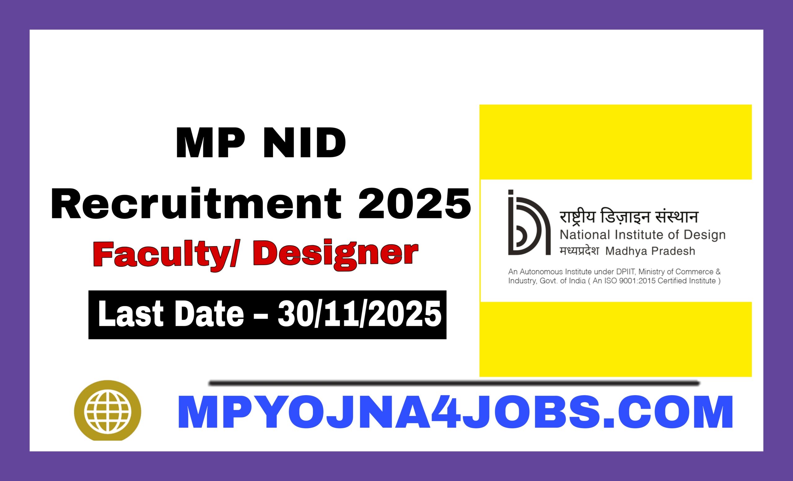 MP NID Recruitment 2025 – राष्ट्रीय डिजाइन संस्थान भोपाल द्वारा फैकल्टी एवं डिजाइनर के विभिन्न पदों पर भर्ती के लिए नोटिफिकेशन जारी कर दिया है जिसके आवेदन ऑफलाइन माध्यम से भरे जाने लगे है । योग्य एवं इच्छुक उम्मीदवार अपना आवेदन , आवेदन की अंतिम तिथि 30 नवंबर 2025 तक जमा कर सकता है । आवेदन से संबंधित विभिन्न जानकारी नीचे दी गई है।