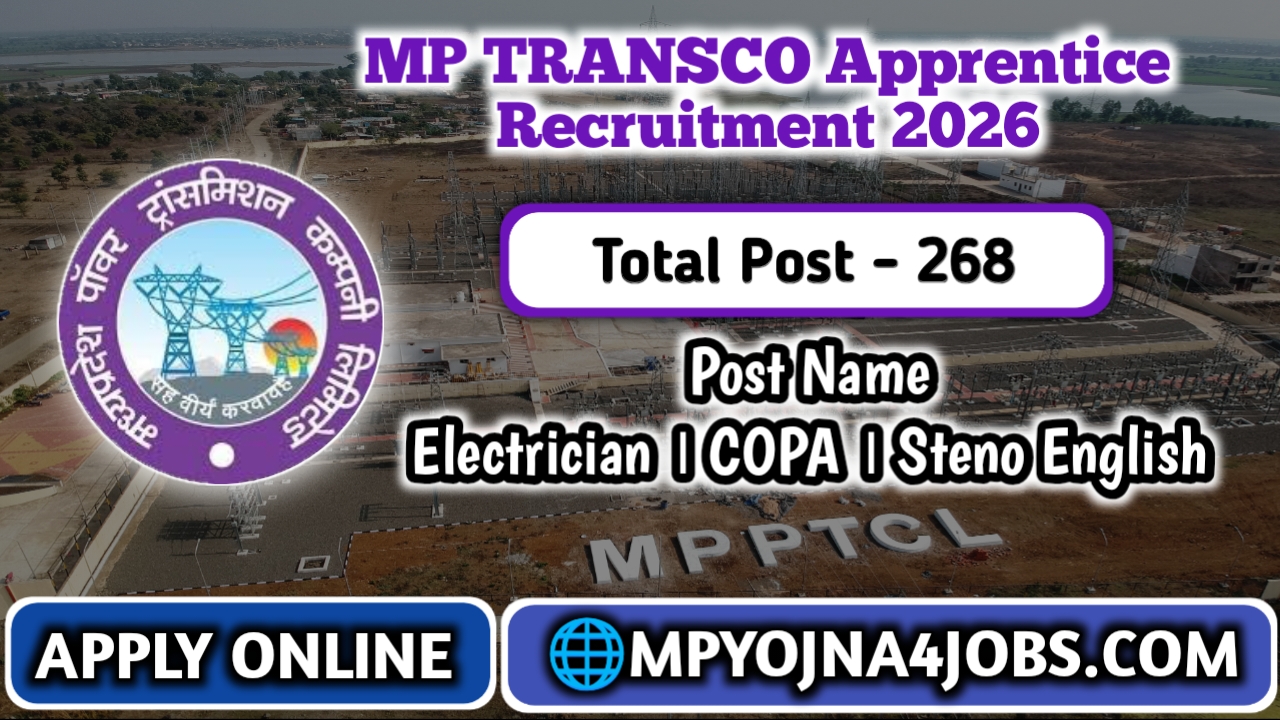 MP TRANSCO Apprentice Recruitment 2026 – मध्यप्रदेश पावर ट्रांसमिशन कंपनी लिमिटेड द्वारा इलेक्ट्रिशियन , कोपा एवं स्टेनोग्राफर इंग्लिश अप्रेंटिस के 268 पदों पर भर्ती के लिए नोटिफिकेशन जारी कर दिया है जिसमें योग्य एवं इक्छुक उम्मीदवार अपना आवेदन ऑनलाइन माध्यम से 01 मई 2026 से आवेदन की अंतिम तिथि 31 मई 2026 तक कर सकते है आवेदन से संबंधित अधिक जानकारी नीचे दी गई है।