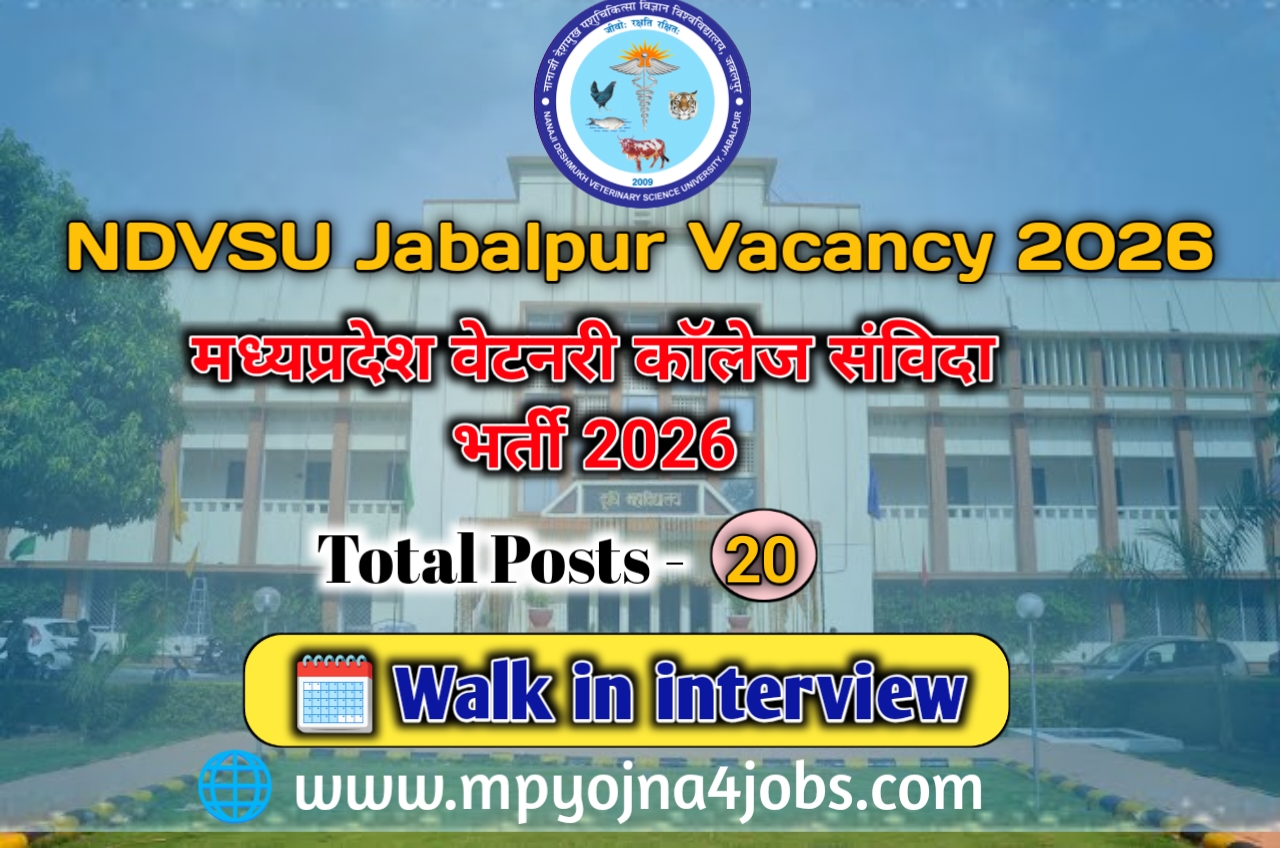 NDVSU Jabalpur Recruitment 2026 – मध्यप्रदेश नानाजी देशमुख पशु चिकित्सा विज्ञान विश्वविद्यालय द्वारा 20 पदों पर भर्ती के लिए नोटिफिकेशन जारी कर दिया है जिसके आवेदन ऑफलाइन माध्यम से साक्षात्कार (इंटरव्यू) के दिन साथ लेकर जाना है । आवेदन से संबंधित अधिक जानकारी नीचे दी गई है ।